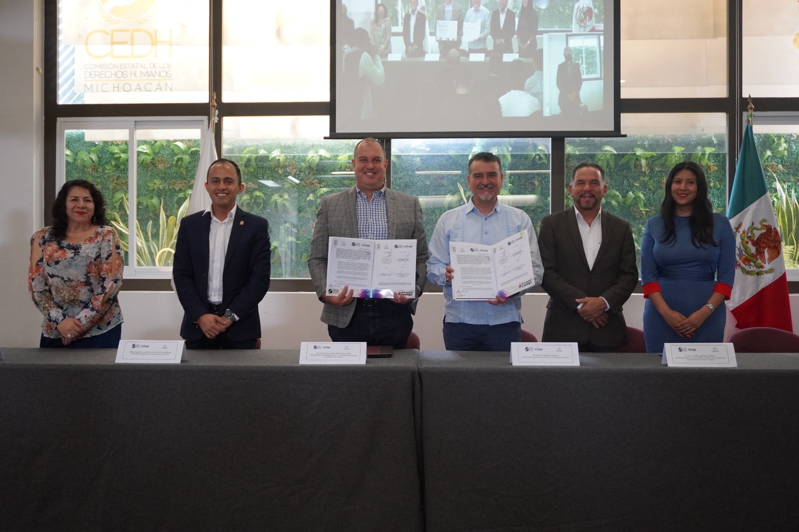 Atestiguaron la firma del convenio el Secretario Ejecutivo de la CEDH, Angel Botello Ortiz; la jefa del departamento de Licenciatura y Posgrados de la UNIVIM, Maribel Valdez Solís; el director de Planeación y Vinculación de la UNIVIM, Gustavo Isidoro Velázquez Barbosa, y la coordinadora de Orientación Legal, Quejas y Seguimiento de la CEDH, Amelia Gil Rodríguez.
