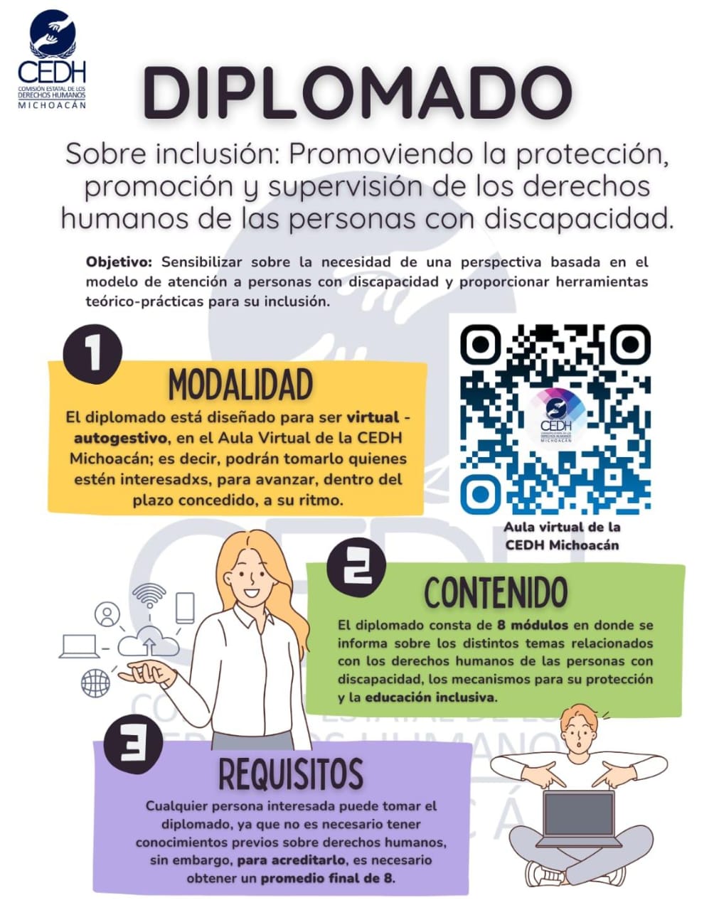 El diplomado se imparte de manera virtual a través de la página web del organismo https://cedhmichoacan.org, tiene una duración de 133 horas y está estructurado en ocho módulos temáticos que tienen como finalidad contribuir en la construcción de una sociedad inclusiva sobre los principios de igualdad y no discriminación.