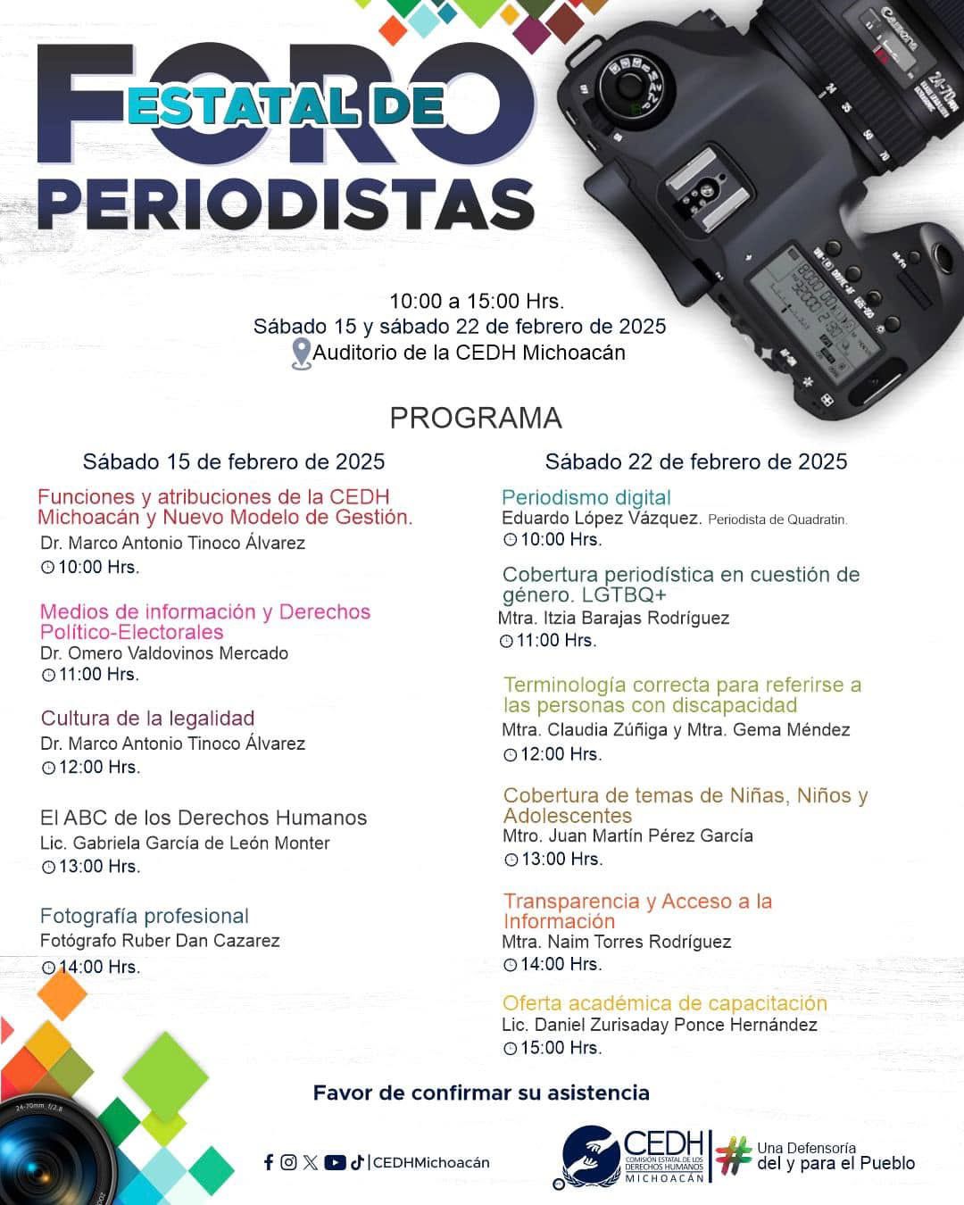 El Foro se desarrollará durante los próximos sábados 15 y 22 de febrero, en el auditorio de la Comisión, ubicado en la calle Fernando Montes de Oca, número 108, en la colonia Chapultepec Norte, de la ciudad de Morelia, en un horario de 10 de la mañana a las 3 de la tarde.