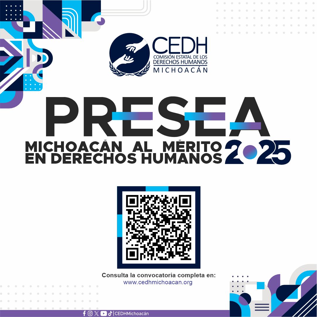 Morelia, Michoacán, a 15 de octubre de 2025. Con el objetivo de reconocer la trayectoria de personas, instituciones públicas o privadas, unidades académicas u organizaciones de la sociedad civil que hayan aportado estudios, investigaciones y/o acciones, o que se distingan por su constante lucha en la promoción, respeto y protección de los Derechos Humanos, primordialmente en el estado de Michoacán o a favor de las personas michoacanas, la Comisión Estatal de los Derechos Humanos de Michoacán (CEDH), da a conocer la convocatoria de la Presea Michoacán al Mérito en Derechos Humanos, edición 2025.