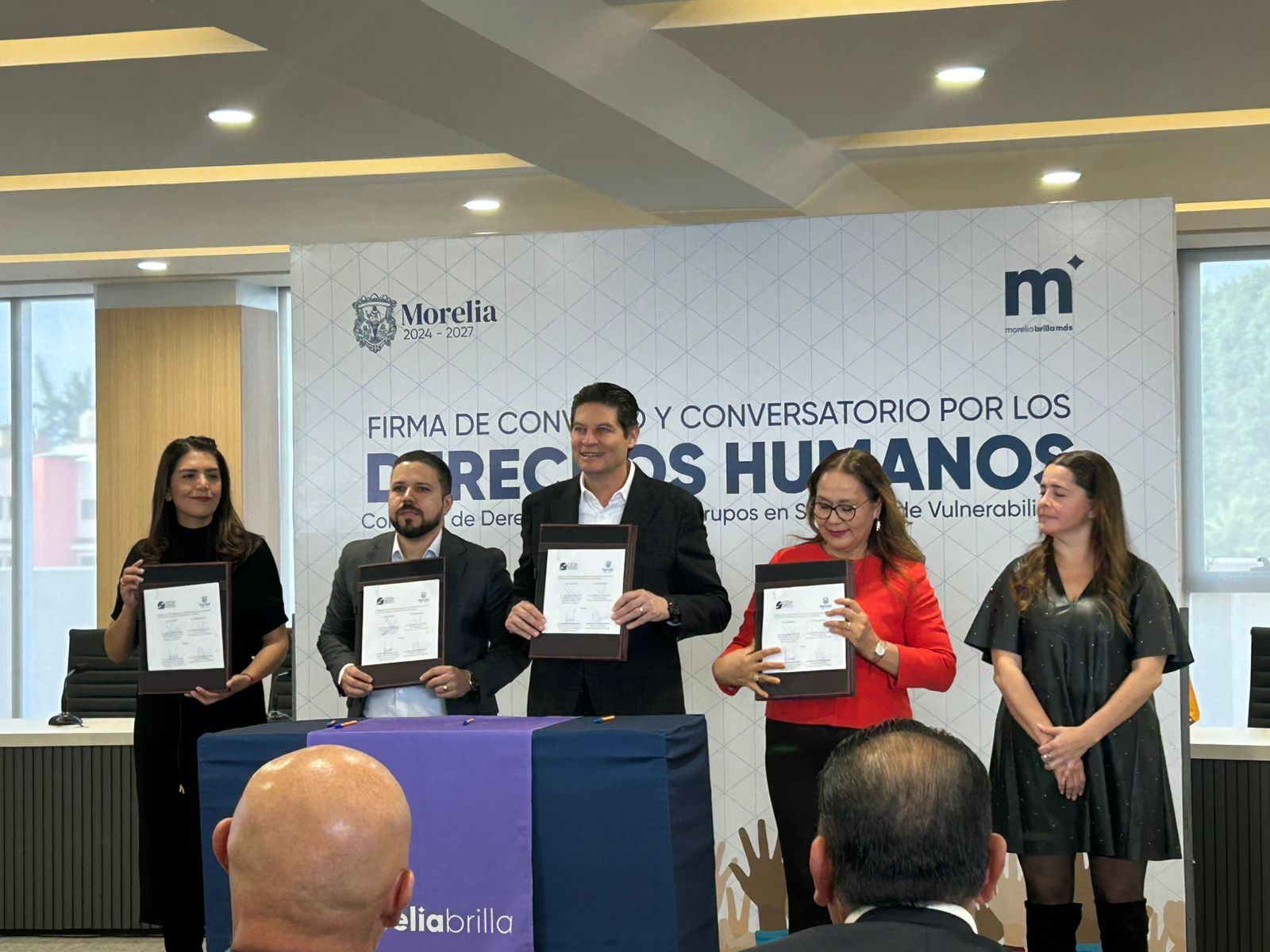 Morelia, Michoacán, 08 de diciembre de 2025.- En el marco de la conmemoración del Día Internacional de los Derechos Humanos, que tendrá lugar el próximo 10 de diciembre, la Comisión Estatal de los Derechos Humanos de Michoacán, presidida por Josué Mejía Pineda, y el Ayuntamiento de Morelia, a través del presidente municipal, Alfonso Martínez Alcázar, firmaron un convenio de colaboración.