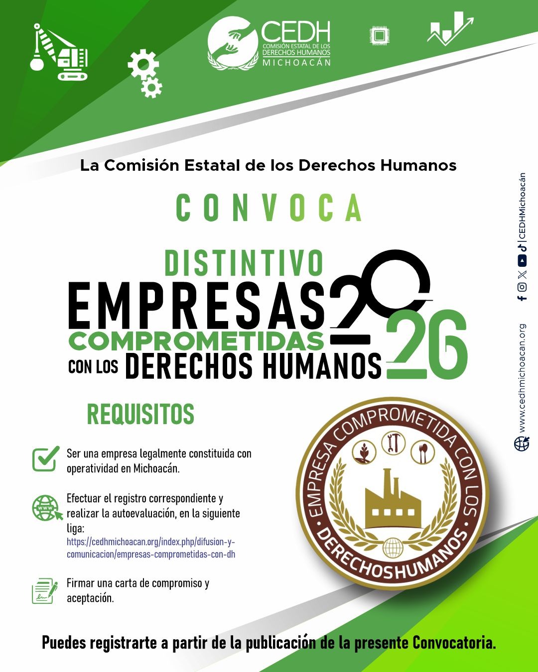 Morelia, Michoacán, a 23 de marzo de 2026.- La Comisión Estatal de los Derechos Humanos de Michoacán (CEDH) publicó la Convocatoria dirigida a empresas de la entidad interesadas en obtener el Distintivo “Empresas Comprometidas con los Derechos Humanos 2026”, con el objetivo de promover prácticas laborales responsables, inclusivas y respetuosas de la dignidad humana.
