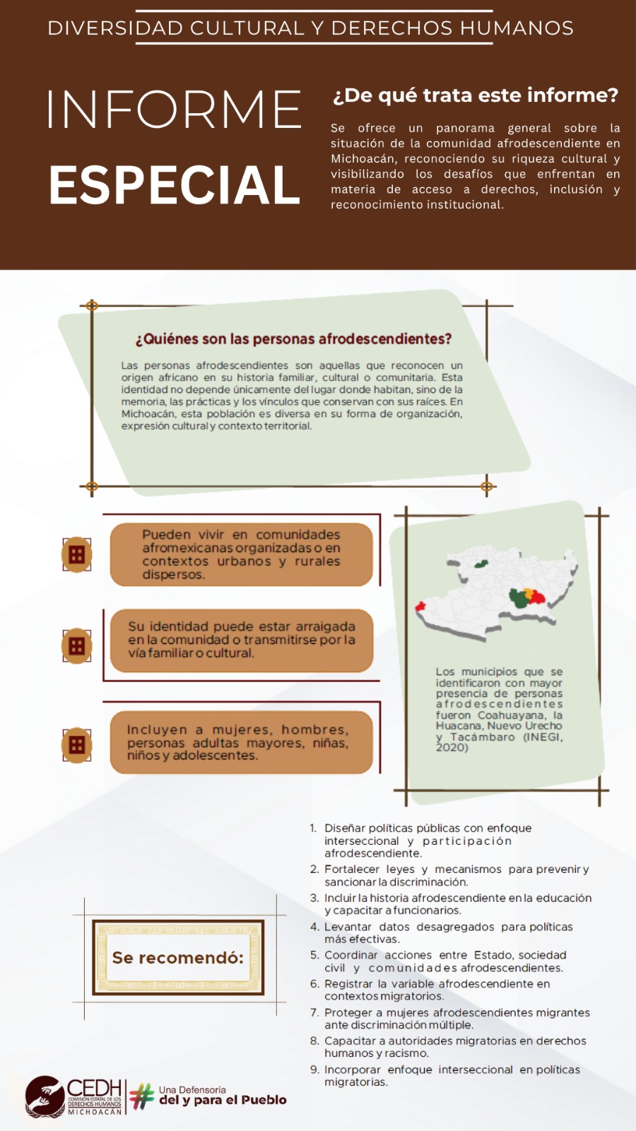 Se ofrece un panorama general sobre la situación de la comunidad afrodescendiente en Michoacán, reconociendo su riqueza cultural y visibilizando los desafíos que enfrentan en materia de acceso a derechos, inclusión y reconocimiento institucional. Las principales problemáticas identificadas fueron la discriminación por apariencia, falta de empleo, falta de apoyo gubernamental a través de programas sociales, falta de respeto a costumbres y tradiciones, acceso a la educación, acceso a la salud y detención arbitraria.